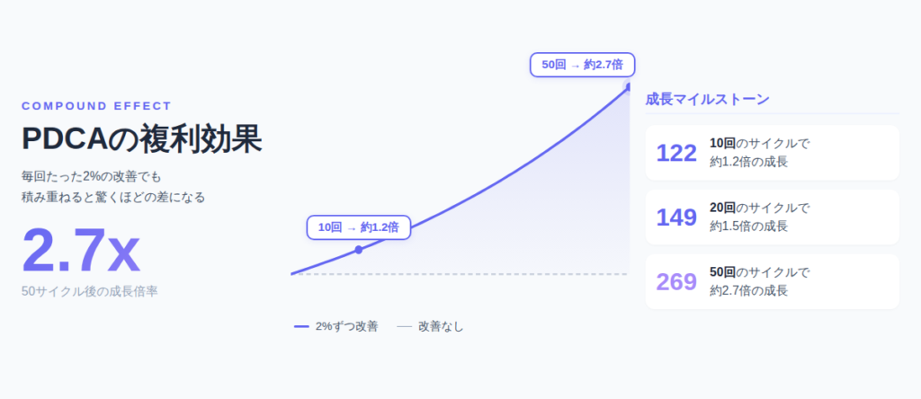 小さな改善を甘く見てはいけない。 PDCAの複利効果は、続けた人だけが手にできる武器です。