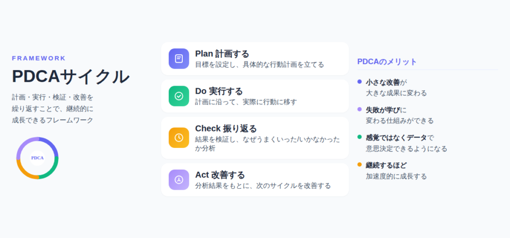 この経験を通じて、PDCAは仕事はもちろん、自己成長全般に使える最強のフレームワークだと確信しました。